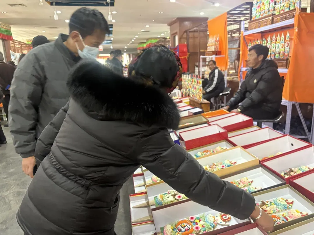 一个个精美的酥油花经师傅们精心制作后,便经过包装便辗转到八廓商城售卖,“仁布亚德酥油花”这个独有的品牌字样也极为醒目。据悉,年前的八廓商城里,70多个酥油花摊位上,大多商户都来自日喀则市仁布县,他们每年都会专程赶来兜售。此时临近晌午,放眼望去,摊位上一排排酥油花整齐陈列,莲花、祥云、鲤鱼等传统图案栩栩如生,细节精致,引得顾客频频驻足。“我是仁布普松乡的,今年酥油花生意格外红火!去年光靠这门手艺就赚了一万多,照眼下这势头,今年的收入肯定能再上一个台阶!”来自仁布的商户塔杰脸上满是笑意,话语里透着藏不住的喜悦。