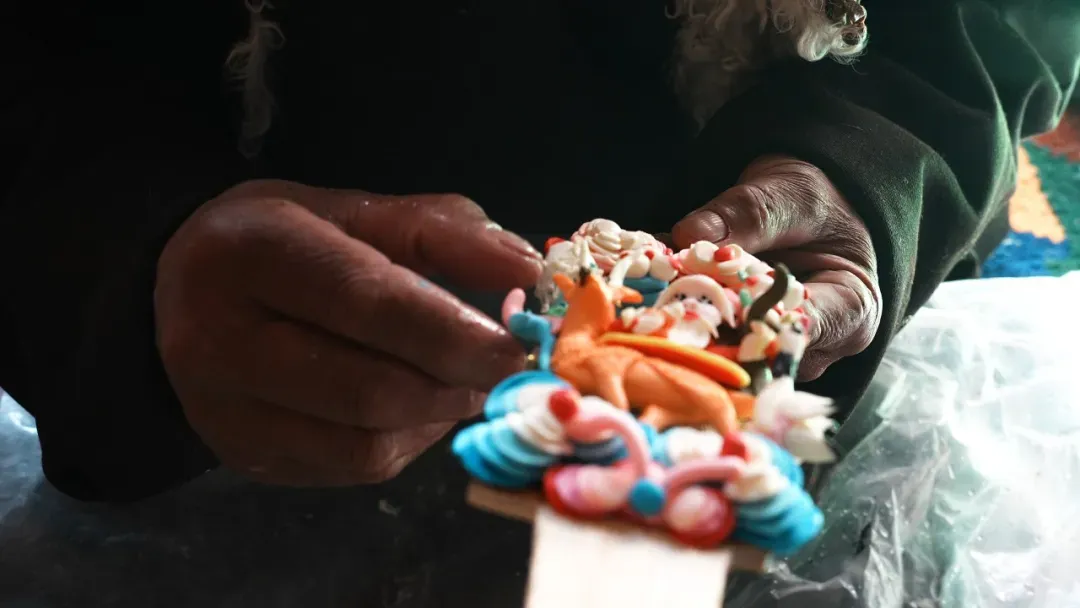 酥油花的制作工艺容不得半点马虎,罗布的徒弟次仁便是在漫长的学习和摸索中慢慢出师。磋磨、揉捻、塑形、图案的巧思,每一个环节都至关重要。午后的光影透进屋内,次仁手上的动作却没有丝毫停歇。正值寒冬,制作酥油花却需要反复将双手浸入冰水中塑形,刺骨的凉意丝毫没有冲淡他对这门技艺的热忱。