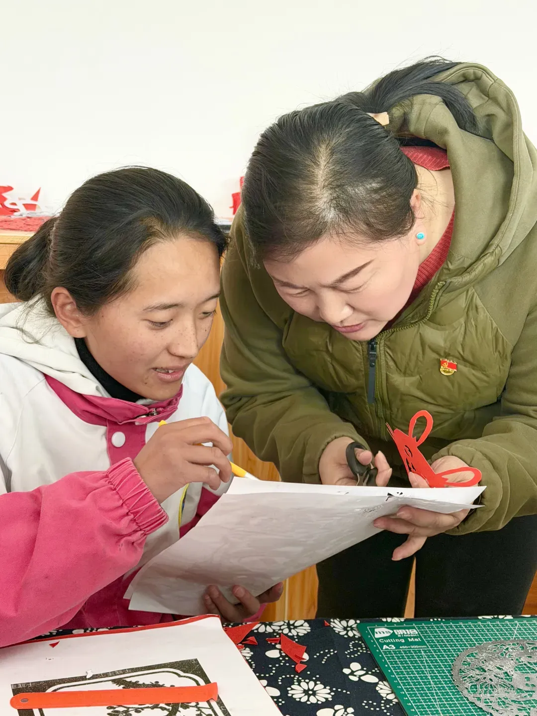 一旁的剪纸社团暖意融融。崔现英老师正耐心细致地指导孩子们剪纸,从折纸、描线到下剪、修边,她手把手教学、面对面示范。学生们围坐在一起,认真聆听、互相学习,一张张红纸在指尖翻转跳跃,化作吉祥纹样、民族团结主题图案和生动的校园剪影,在一刀一剪中传承文化基因、增进民族情谊。