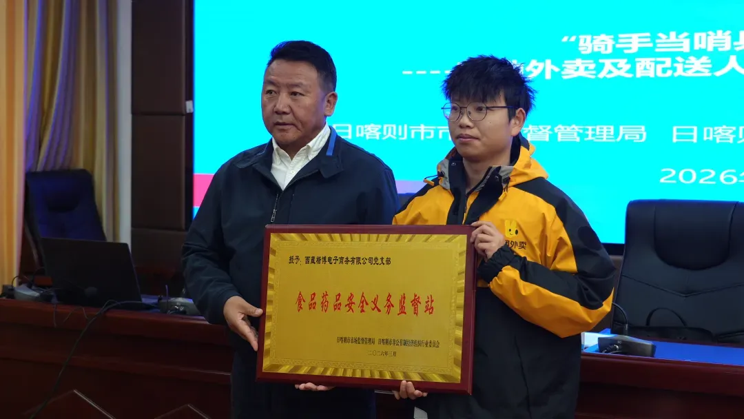 3月23日,日喀则市市场监督管理局举办食品药品安全违法行为举报倡议活动,正式设立全市首家非公经济组织“食品药品安全义务监督站”,并为43名外卖小哥授予“食药安全义务监督员”身份,进一步筑牢市民“舌尖上的安全”防护线。